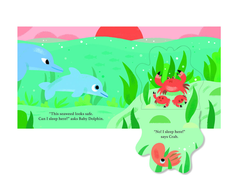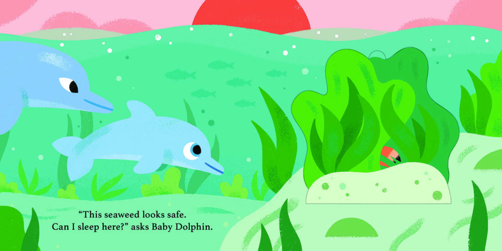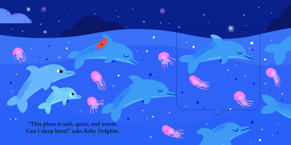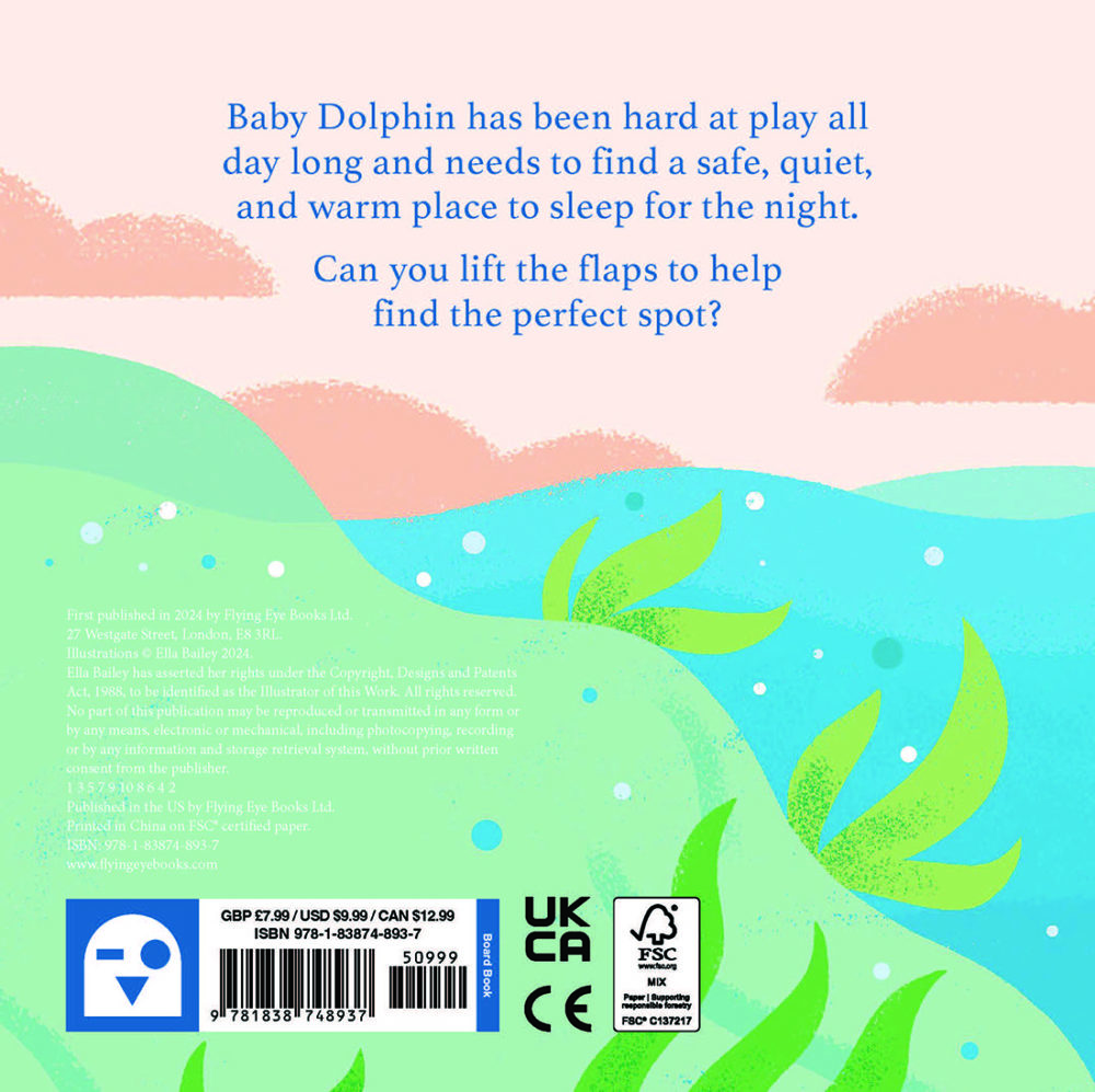Baby dolphin has been hard at play all day long and needs to find a safe, quiet and warm place to sleep for the night. Can you lift the flaps to help find the perfect spot?