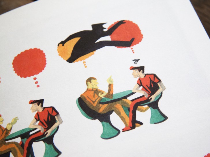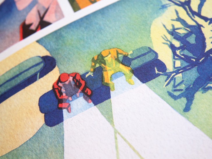 The Spectators unfolds as a poetic and philosophical introspection on the nature of man. Victor Hussenot‘s palette is awash with subtle colour, gently carrying the narrative and allowing the reader to envelop themselves in the lyricism of the work. Reminiscent of French New Wave cinema with its clipped dialogue, gentle pacing and departure from a classic narrative structure, The Spectators is an exciting new graphic novel.