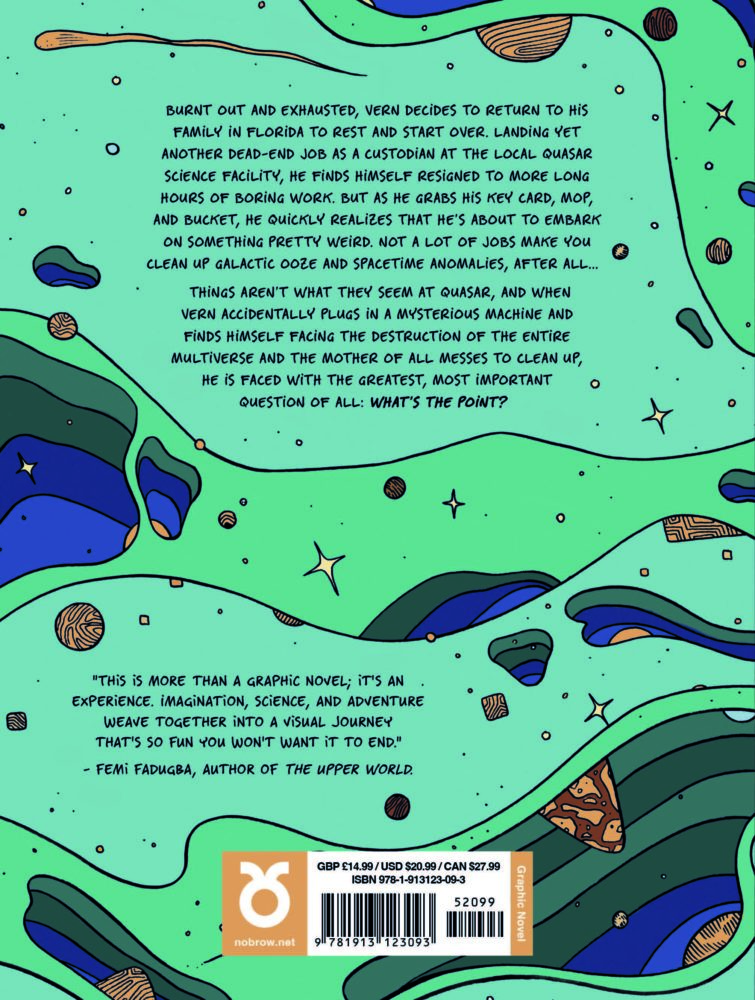 On the edge of burnout, Vern decides to return to his family in the Sunshine State to start over. Starting a new dead-end job as a custodian at Quasar—a local science facility with a shady motive—he shrugs on his uniform, grabs a mop and bucket, and trudges off to clean up… Black holes? Space-time anomalies? Galactic ooze? Things aren’t entirely what they seem at Quasar, and when Vern accidentally plugs in a mysterious machine and finds himself standing on the brink of the destruction of every planet in the Multiverse, he finds himself presented with the greatest question of all: what is the point?